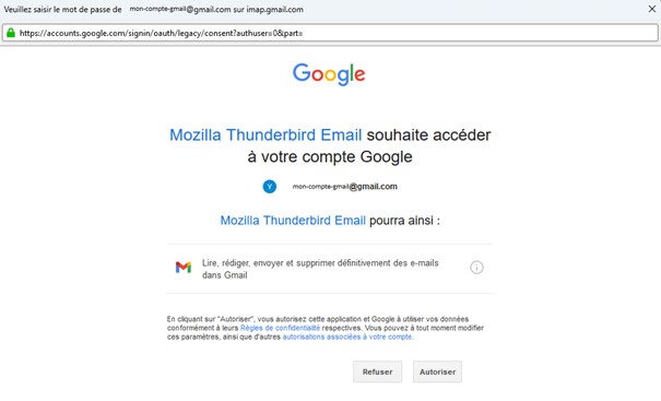 Figure 2 : Exemple où l'on permet à un client de messagerie (ici Mozilla Thunderbird) d'accéder aux mails d'un compte Google
